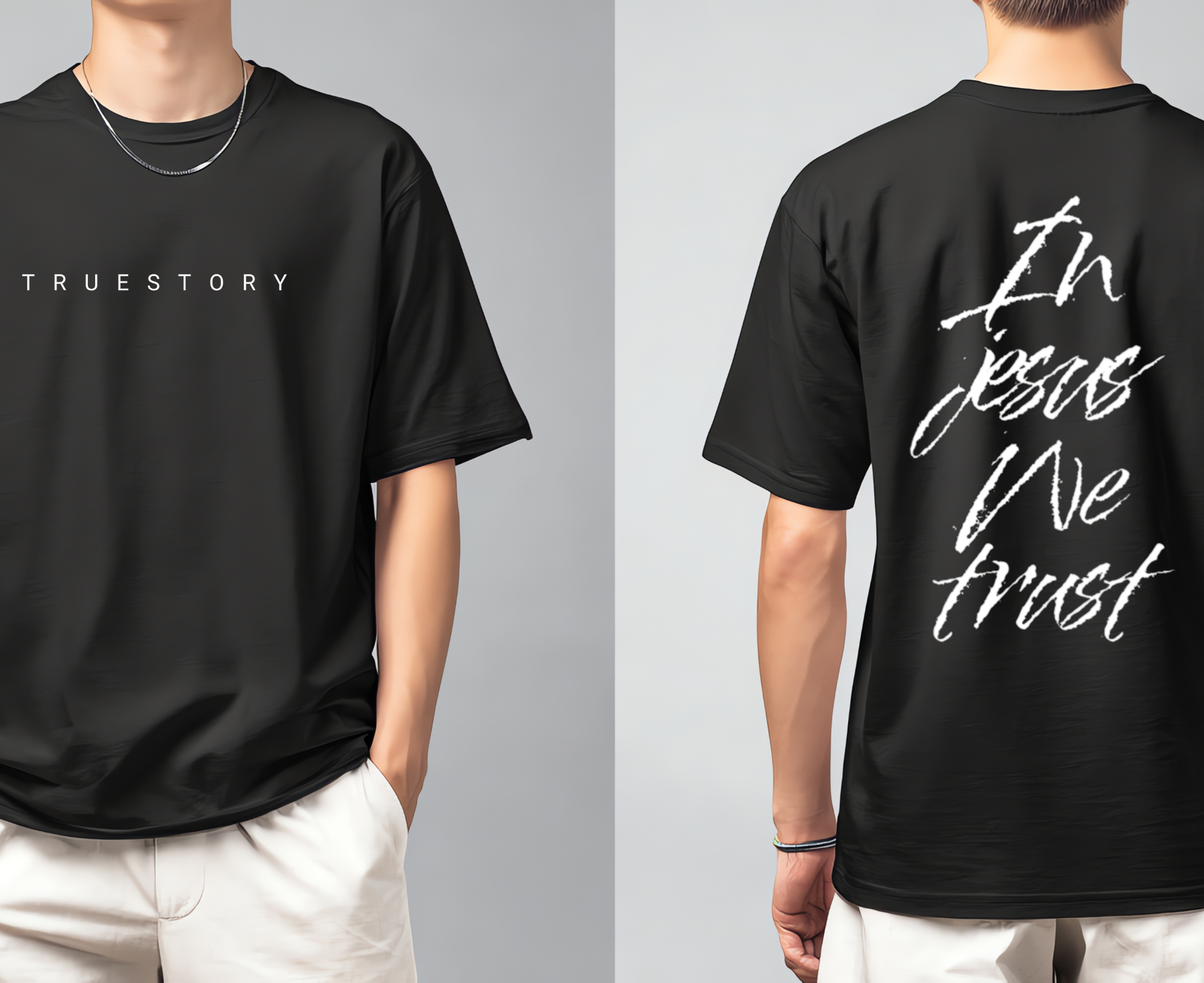 The TRUESTORY “In Jesus We Trust” set blends bold belief with minimalist design. The front keeps it clean with TRUESTORY lettering, while the back makes a statement in raw handwritten script — In Jesus We Trust.