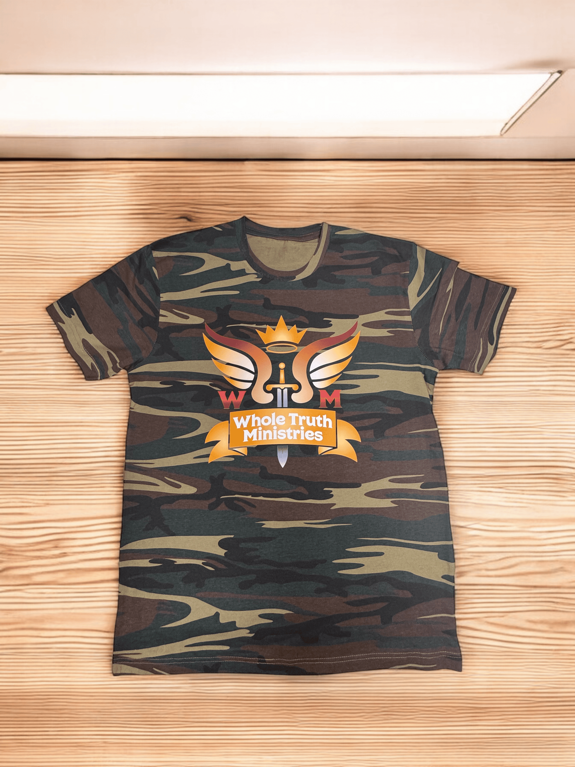 Unleash the power of the Whole Truth Camo Tee, the ultimate camouflage short sleeve tee. Crafted with unmatched quality, it features the striking Whole Truth Ministries logo in vibrant colors and a luxurious soft feel, thanks to cutting-edge DTF transfers. An embroidered logo option is also available for a different style. Wear it to make a bold statement and embrace your local pride with this distinctive piece of apparel from New Castle’s heart.
